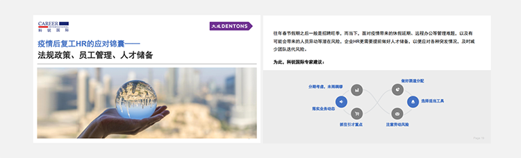 为了帮助众多企业人力资源工作者应对挑战,PA真人视讯国际联合国内知名律所“大成律师事务所”,推出疫情后《复工HR的应对锦囊》手册,从法律政策、员工管理、人选储备几个方面对企业HR有序召开复工后的各项人力资源管理给予帮助。